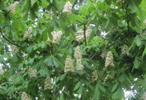 Le marronnier commun ou le marronnier d’Inde (Aesculus hippocastanum L.), aux fleurs blanches ou roses spectaculaires et odorantes, ne vient pas d’Inde comme son nom pourrait le laisser croire mais d’une région située au Nord de la Grèce. Sa longévité peut atteindre plusieurs centaines d’années. Il est l’arbre d’ornement par excellence. Ses graines, les marrons – à ne pas confondre avec les châtaignes – sont impropres à la consommation, mais n’en ont pas moins de grandes vertus médicinales. La graine, son enveloppe et l’écorce sont utilisés depuis longtemps dans la pharmacopée pour leurs propriétés anti-inflammatoire, anti-oedemateuse, vasoconstrictrice et sont efficaces contre l’insuffisance veineuse.